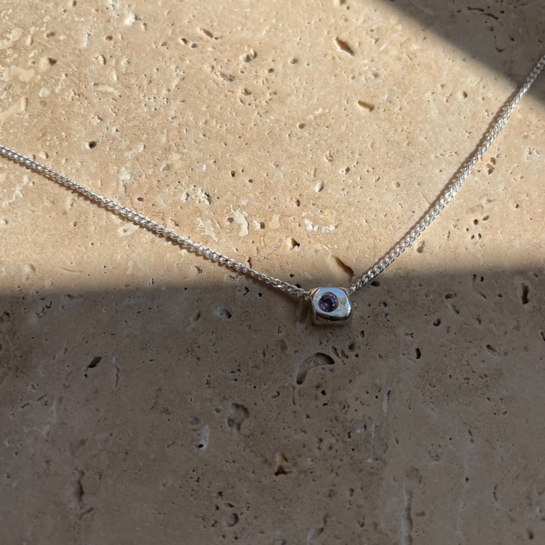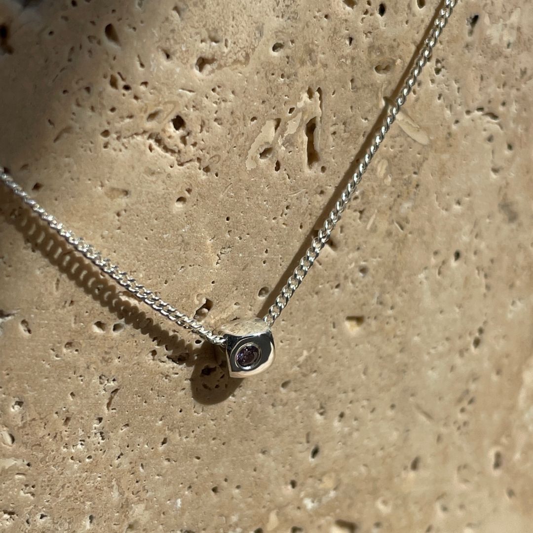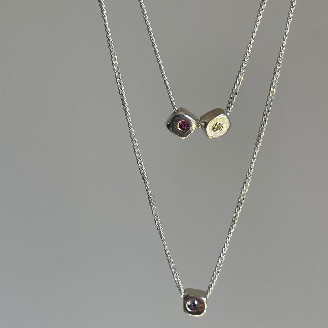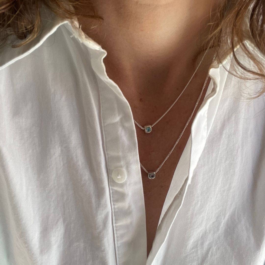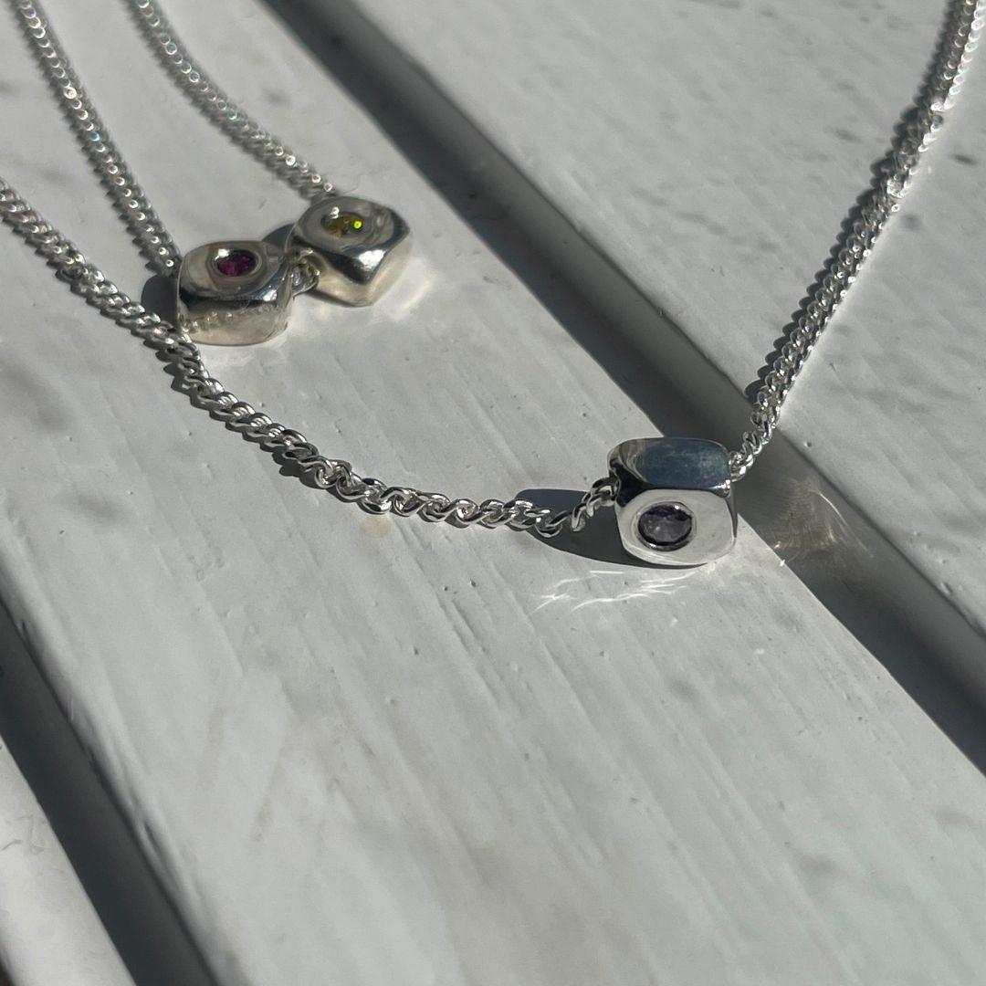 Our Tiny Blocks are expertly crafted using recycled silver or 9ct yellow or rose gold, which are melted and skillfully hammered into the iconic block shape. To ensure a beautiful finish, each block is meticulously sanded, set with a stone, and polished to a stunning high shine. Our diamond curb chain is then threaded through the block.